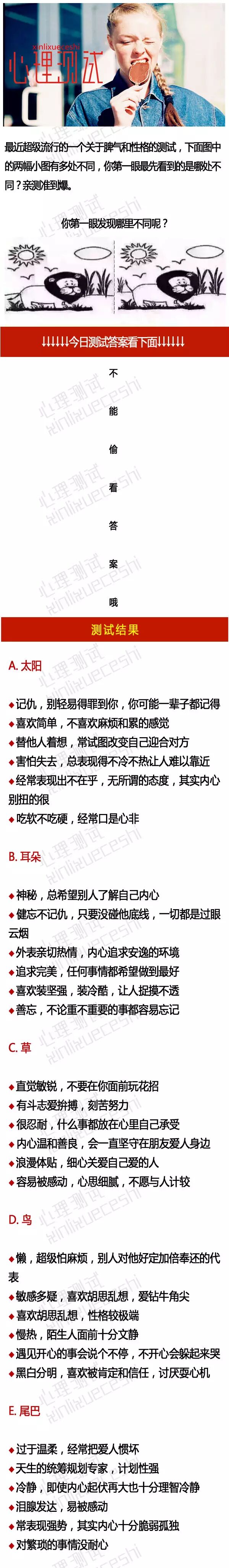 引語:相不相信如果你如實回答下面的七個問題就能測出你的全部呢?包括你的愛情、性格以及金錢世界觀。聽起來好像很玄,但經過測試才發現確實很神奇。讓我們都來領略一下吧。